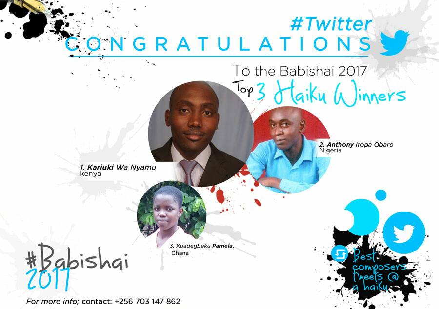On the night of Sunday 6 August, we held our award-giving ceremony of the 2017 Babishai haiku prize. The judges, after intense deliberation, came up with their final list, and in order, we congratulate Kariuki wa Nyamu from Kenya, on emerging first, Anthony Itopa Obaro from Nigeria, on emerging second and Kuadegbeku Pamela from Ghana, on emerging third. Congratulations to all that made it to the shortlist.