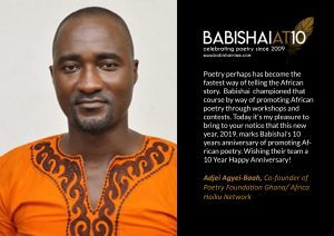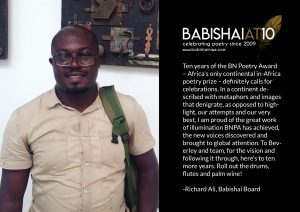 The Babishai Niwe Poetry Foundation, founded by Beverley Nambozo Nsengiyunva, a writer editor, poet, long-distance swimmer, actress and leadership trainer, coordinates annual poetry competitions for Africans. This year, they introduced the Haiku competition, dubbed Babishaiku, they publish poetry by Africans, coordinate creative children’s programs, business programs, annual poetry festivals and poetry mentorship programs.